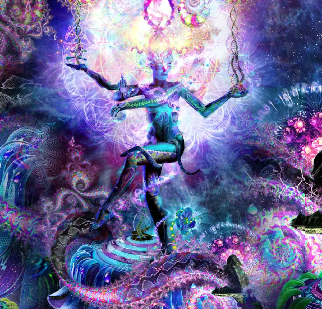 You may have heard my tales of the purple lady I’ve encountered in the DMT space. Nearly a decade ago, I stumbled upon an exact representation of her and found Hakim’s work. His other work such as Universal Transmissions match the visuals in my personal DMT experiences closer than any artist I have ever come across.